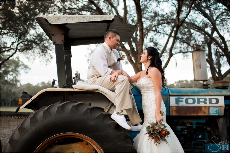 orlando rustic wedding bride and groom on tractor